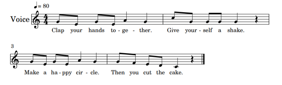 - Clap hands on first phrase, shake body on second, hold hands on third phrase.
